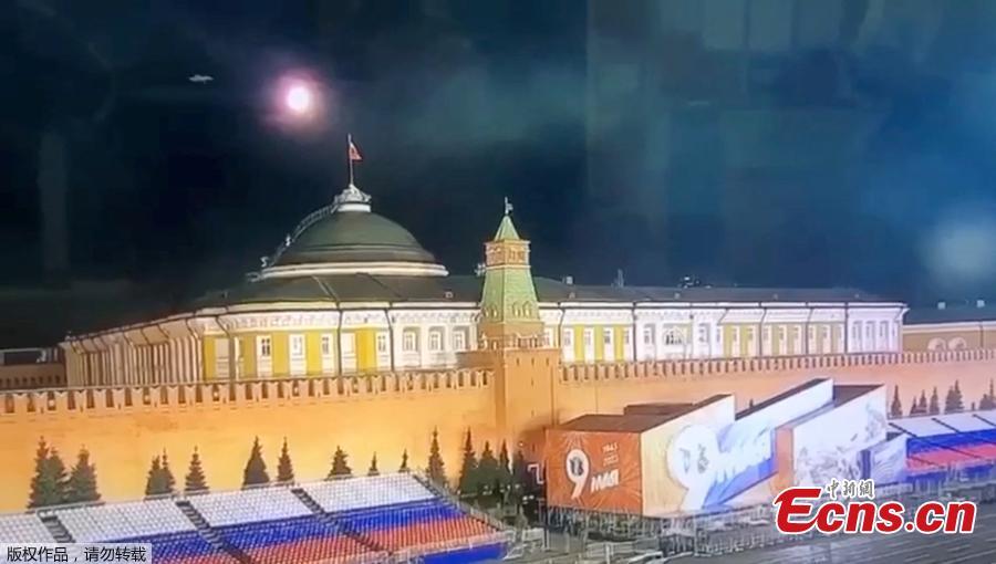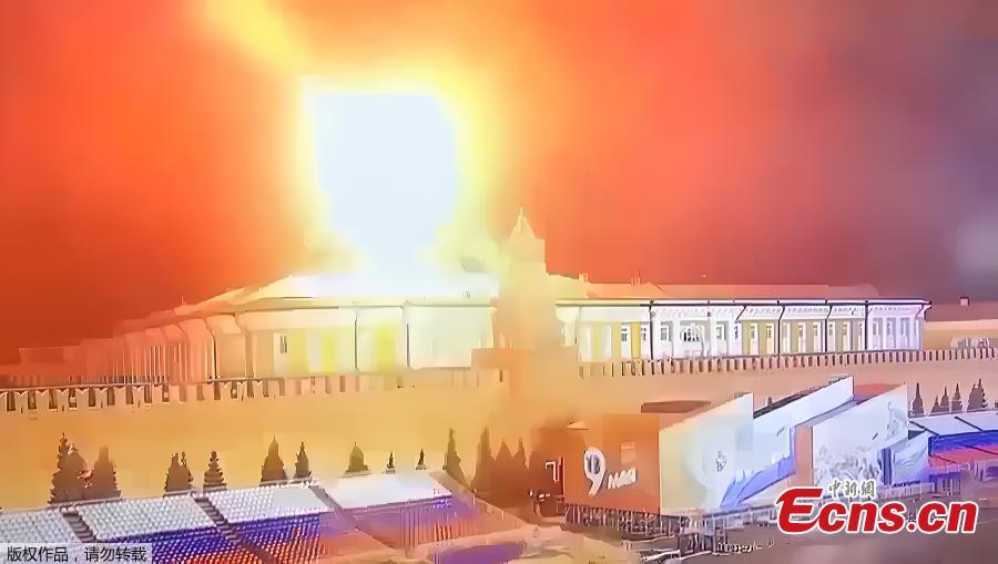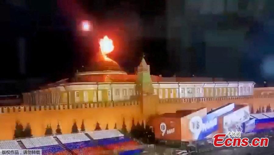A screenshot photo shows a flying object exploding in an intense burst of light near the dome of the Kremlin Senate building in Moscow, Russia, May 3, 2023. (Photo/Agencies)