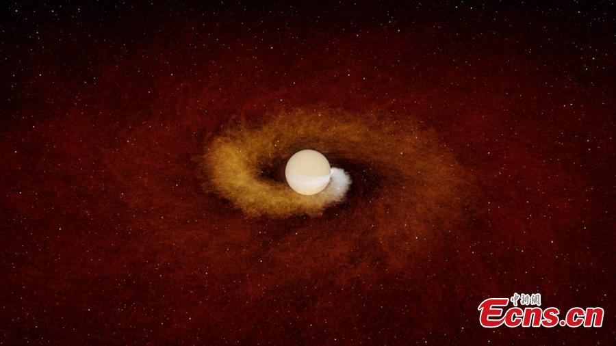 This artist’s concept shows a planet gradually spiraling into its host star. The Jupiter-size planet pulls gas away from the star, sending it into space. There, the gas cools and becomes dust, which is visible to astronomers. (Photo/VCG)