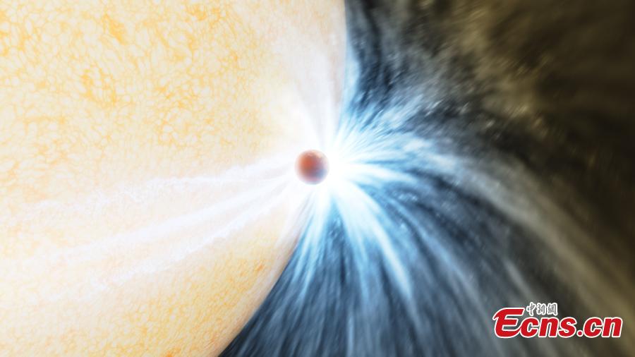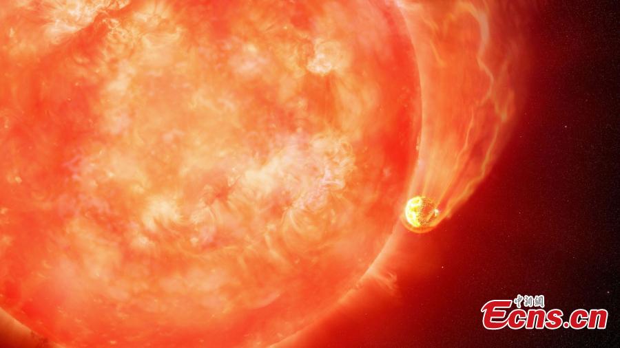 An artist's interpretation released on May 3, 2023 shows a star so bloated that it's engulfing a doomed planet. (Photo/VCG)