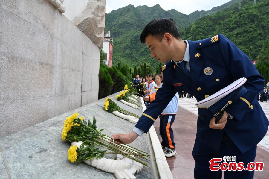 People lay flowers to mourn for the victims of the earthquake during a memorial ceremony marking the 15th anniversary of the Wenchuan Earthquake at the ruined site of Xuankou Middle School in Yingxiu Township of Wenchuan County, southwest China's Sichuan Province, May 12, 2023. (Photo: China News Service/An Yuan)