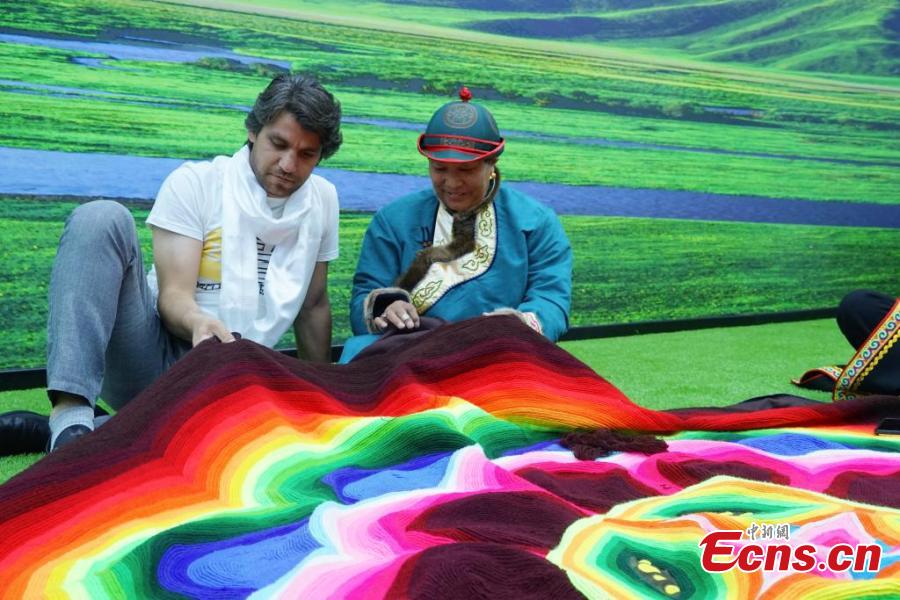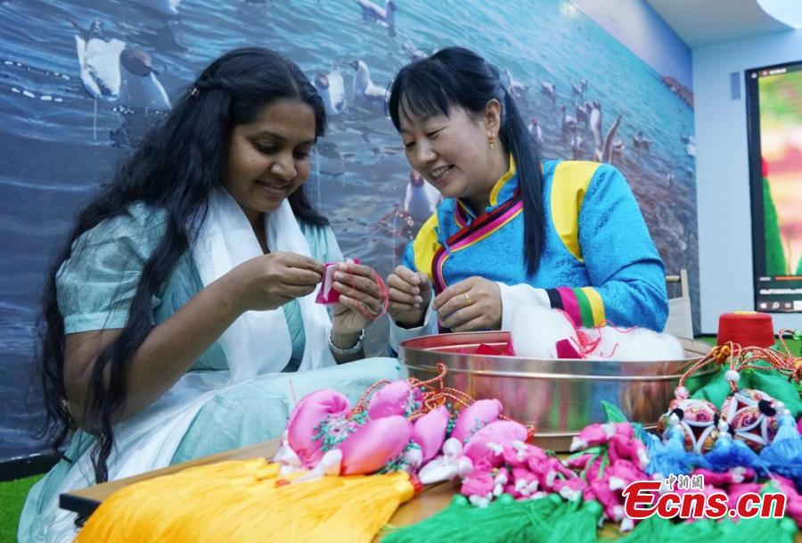 A foreign journalist tries Qinghai embroidery pouch in Xining, northwest China's Qinghai Province, June 13, 2023. (Photo: China News Service/Ma Minyan)
