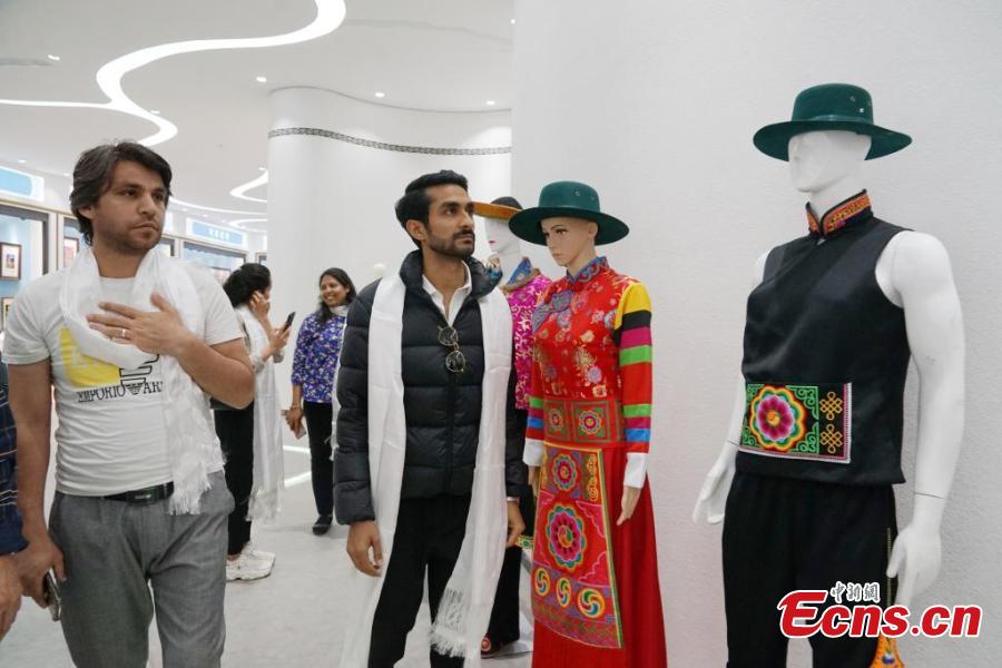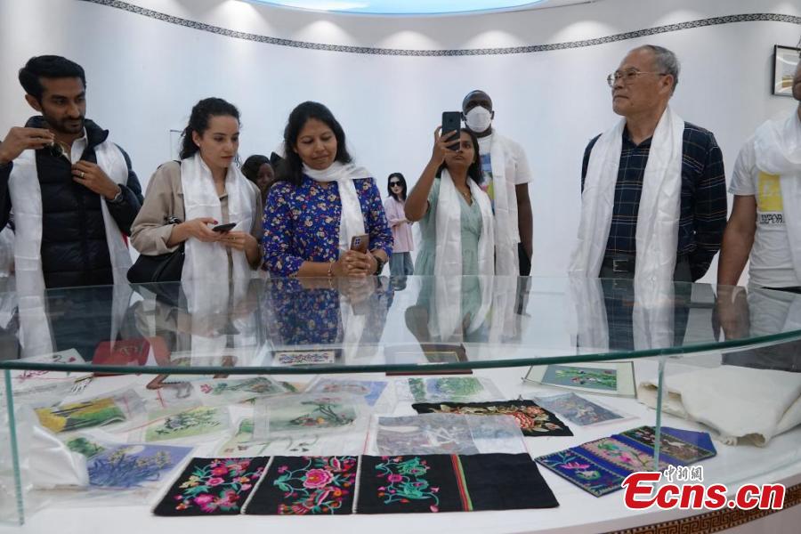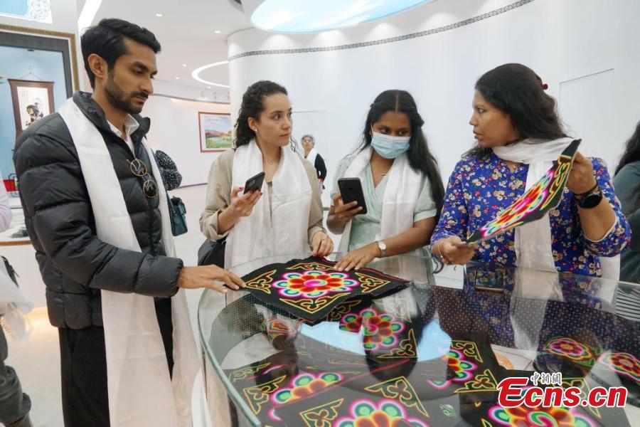 A group of 14 foreign journalists visit Qinghai embroidery digital economy center in Xining, northwest China's Qinghai Province, June 13, 2023. (Photo: China News Service/Ma Minyan)