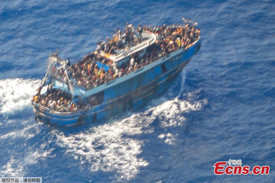 Photo shows scores of people on a battered fishing boat that later capsized and sank off southern Greece, June 14, 2023. (Photo/Agencies)