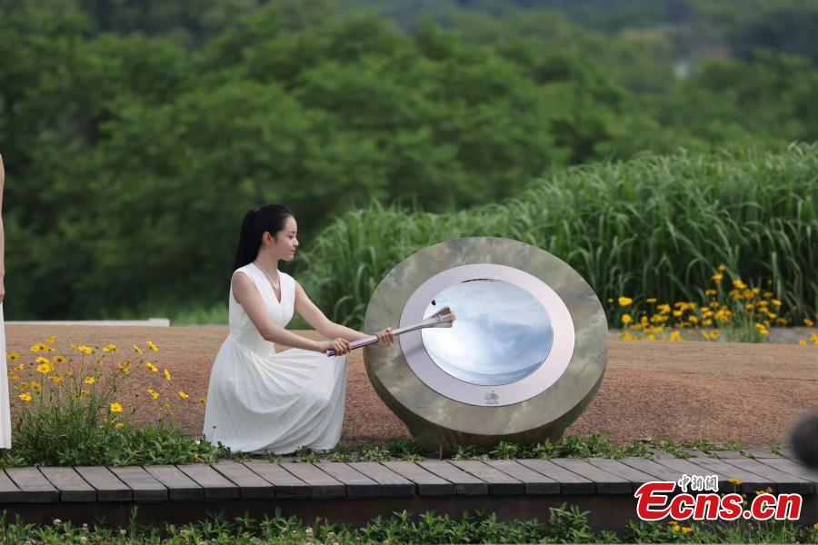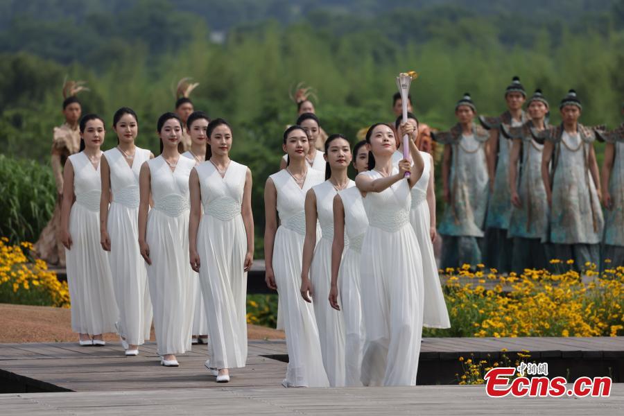 The flame is displayed after being lit during the Hangzhou 2022 Asian Games Flame Lighting Ceremony at the Archaeological Ruins of Liangzhu City park in Hangzhou, east China's Zhejiang Province, June 15, 2023. (Photo/ICphoto)