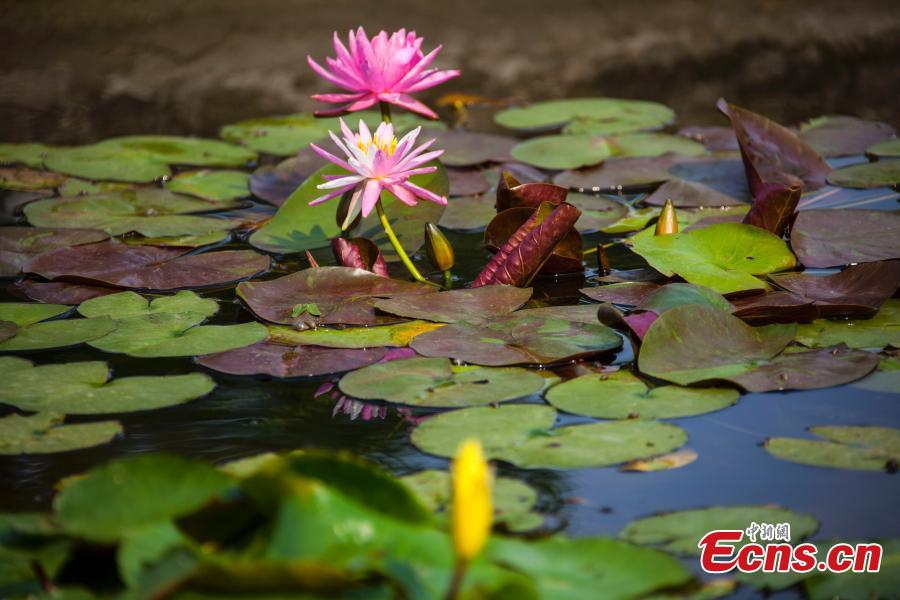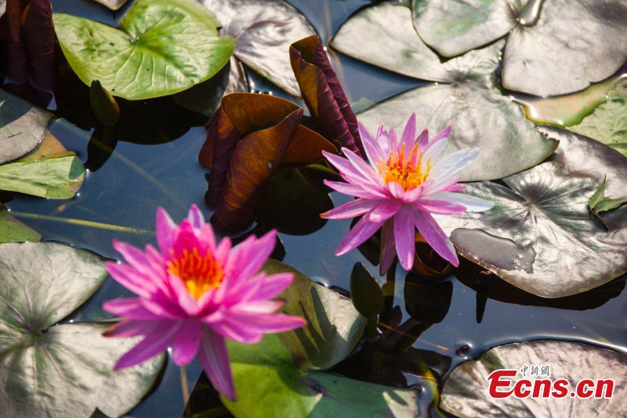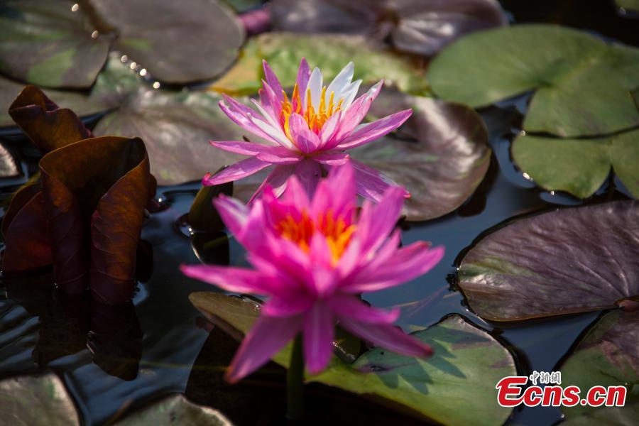 A water lily with two colors is in full bloom, drawing many visitors to Xuanwu Lake Park in Nanjing, east China's Jiangsu Province, June 15, 2023. (Photo provided to China News Service)