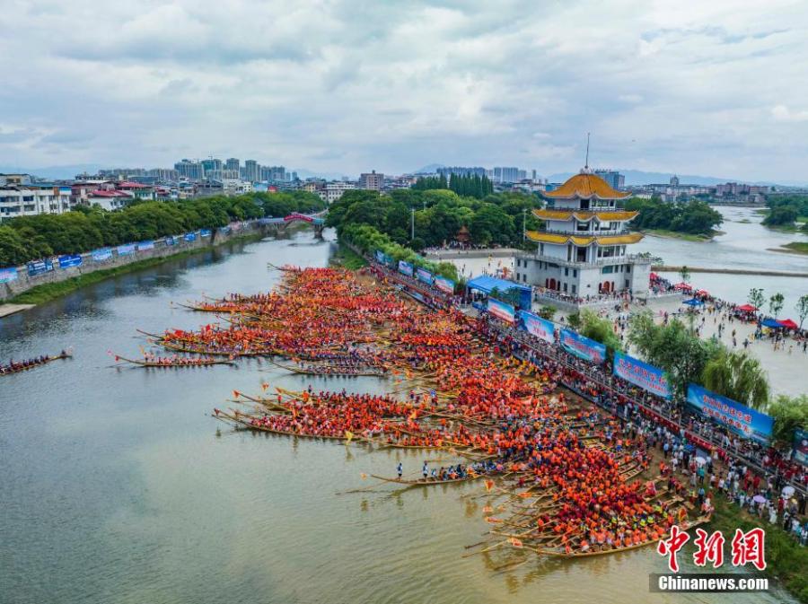 A total of 172 dragon boats and 4,816 participants compete at a dragon boat racing event in Yongzhou, central China's Hunan Province, June 18, 2023. (Photo: China News Service/Jiang Keqing)