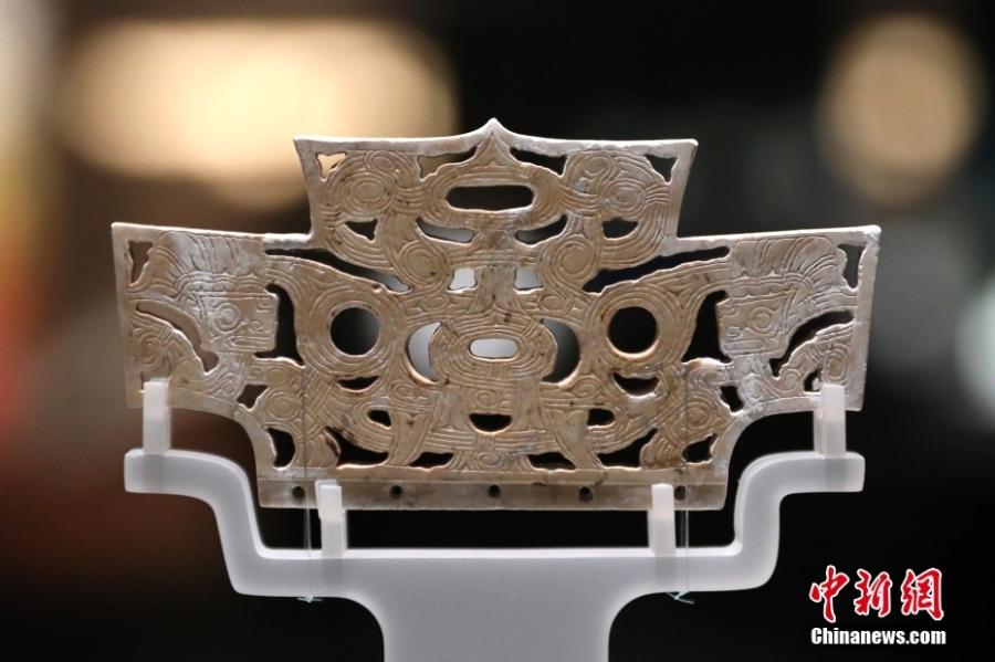 A jade carving is on display during an exhibition titled "The Proof of Early China: The Civilizations of Songze and Liangzhu." at Shanghai Museum, June 19, 2023. (Photo: China News Service/Zhang Hengwei)