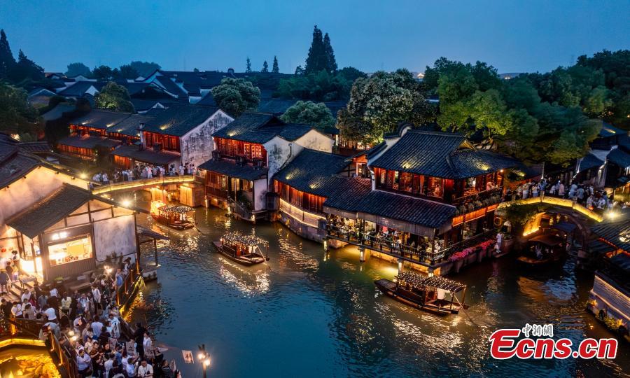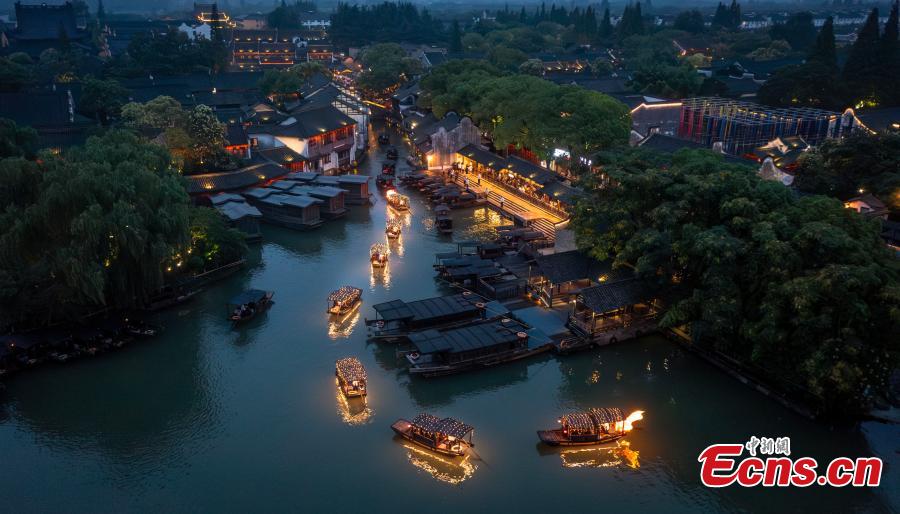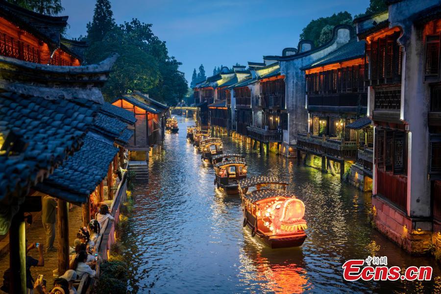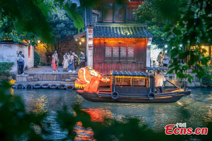 Seven traditional row boats decorated with lanterns float on the river, forming a unique scene of a "dragon fleet" at night and igniting the festive atmosphere in Wuzhen.