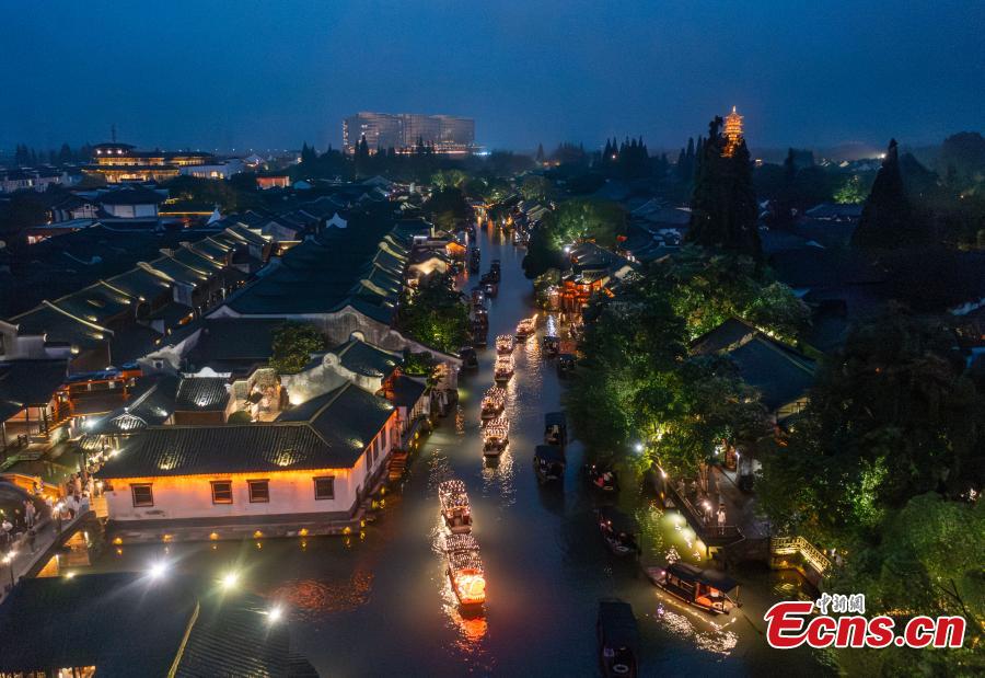 Night scene of "dragon fleet" parading on the river to celebrate the upcoming Dragon Boat Festival in Wuzhen, east China's Zhejiang Province, June 20, 2023. (Photo provided to China News Service)
