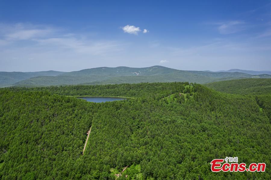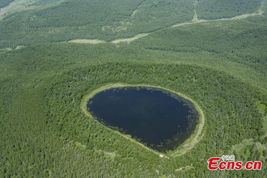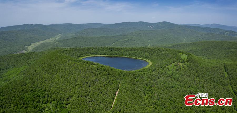 Arxan Tianchi (Heavenly Lake) is surrounded by forest, looking like a mirror on Arxan Mountain in north China's Inner Mongolia Autonomous Region, June 25, 2023. (Photo/VCG)