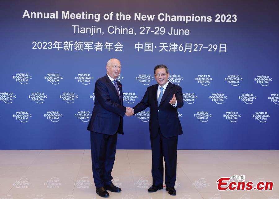 Premier Li Qiang meets with Executive Chairman of the World Economic Forum (WEF) Klaus Schwab in Tianjin, June 26, 2023. (Photo: China News Service/Han Haidan)