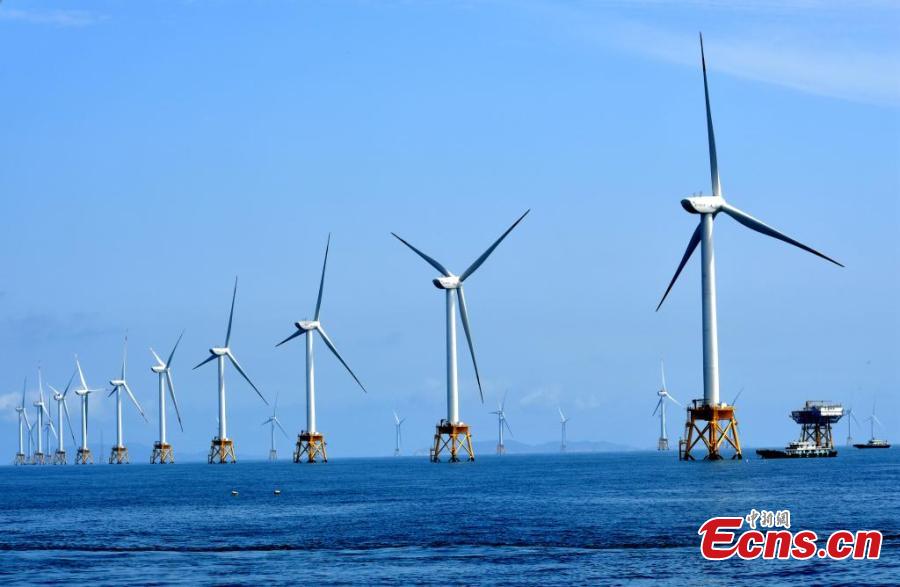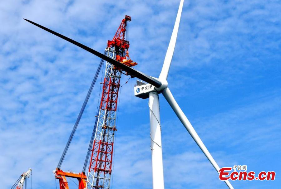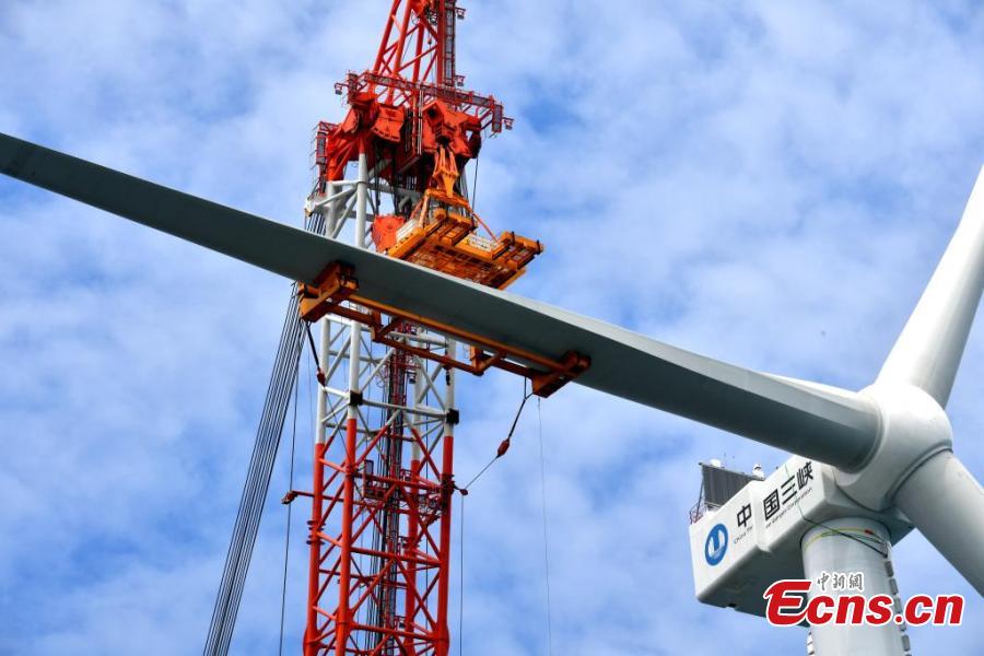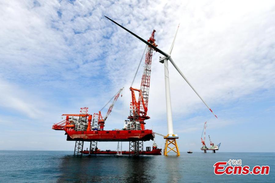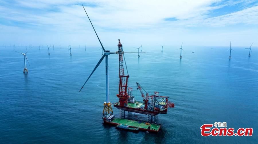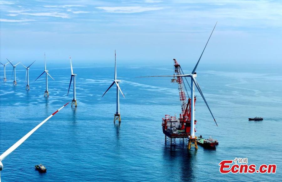 The world's first offshore wind turbine with an installed capacity of 16 megawatts is installed on Baihetan, an offshore platform with a lifting capacity of 2,000 tons, in Pingtan, east China's Fujian Province, June 28, 2023. (Photo: China News Service/Lv Ming)