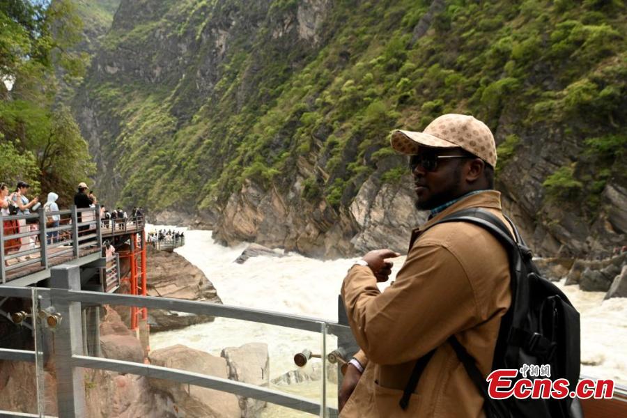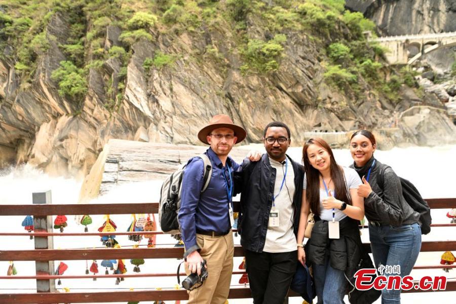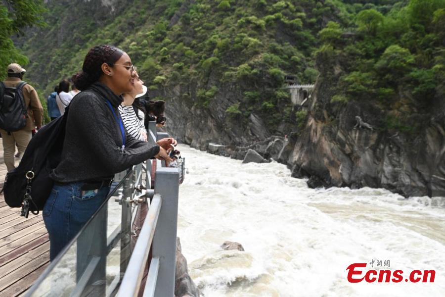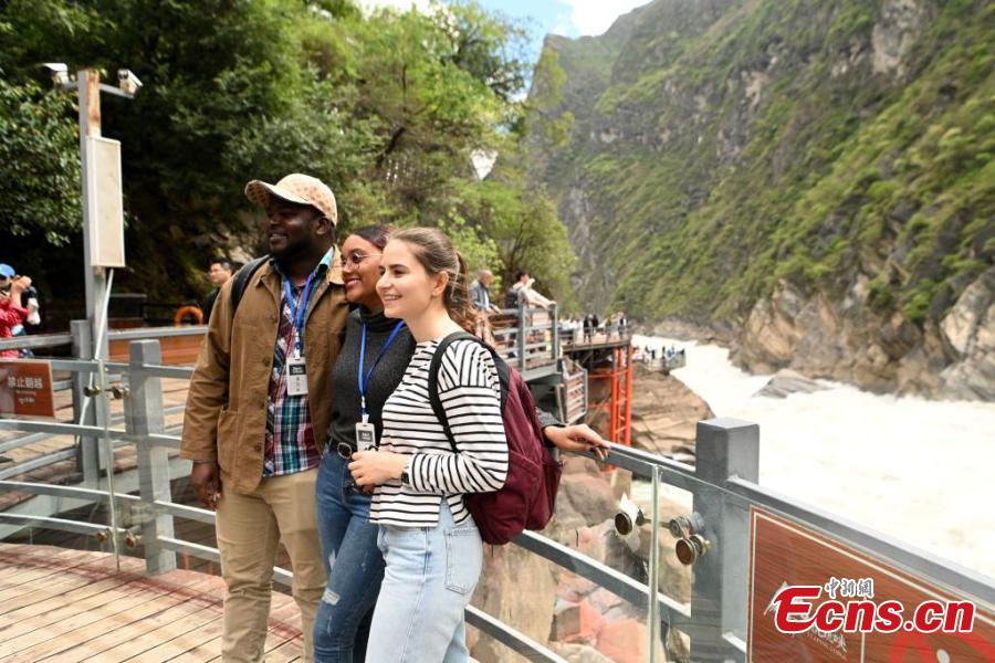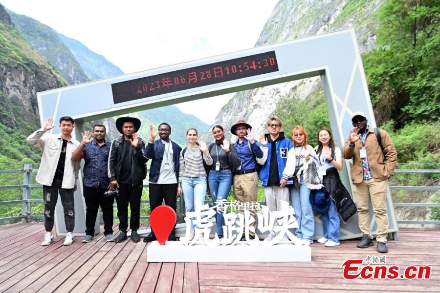 Foreign youth pose for a group photo at the Tiger Leaping Gorge or Hutiaoxia scenic spot along the Jinsha River in Shangri-La City, southwest China's Yunnan Province, June 28, 2023. (Photo: China News Service/Li Jiaxian)