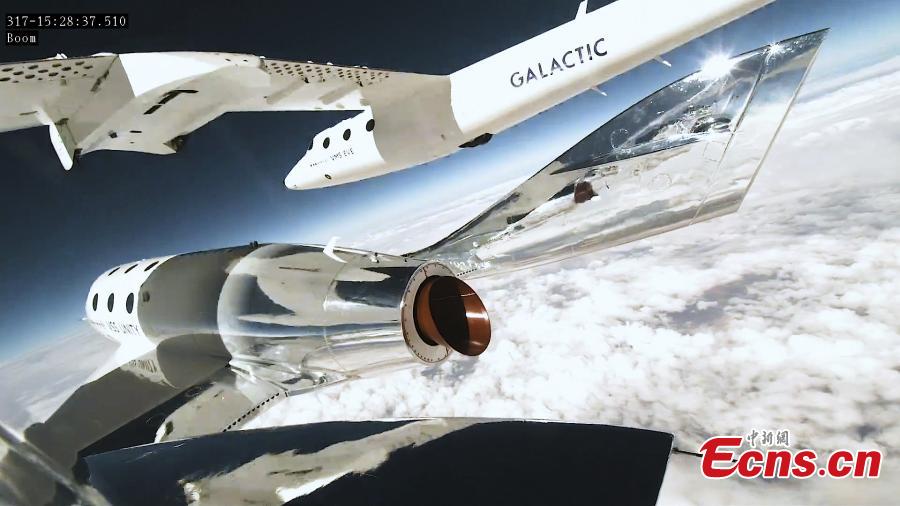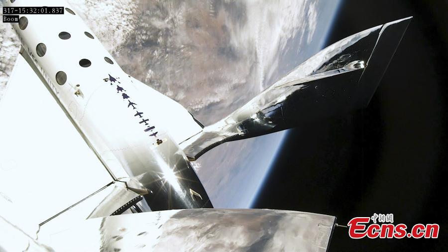 Photo shows the Virgin Galactic's rocket-powered space plane during a research flight before gliding back down to Spaceport America in southern New Mexico, June 29, 2023. (Photo/VCG)