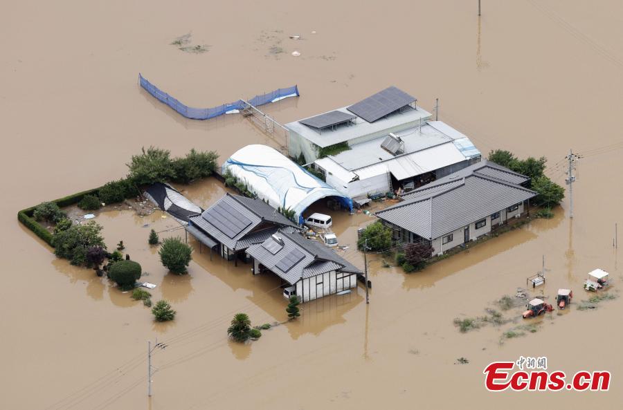 Houses are inundated with floodwater due to heavy rains in Mashiki, Kumamoto Prefecture, Japan, July 3, 2023. (Photo/ICphoto)