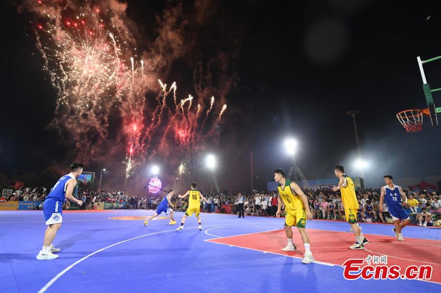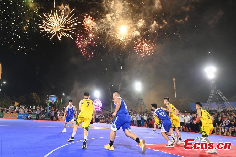 A fireworks show brightened the night sky during the basketball game in Liuyang, , presenting a gorgeous "fireworks basketball game" for the villagers.