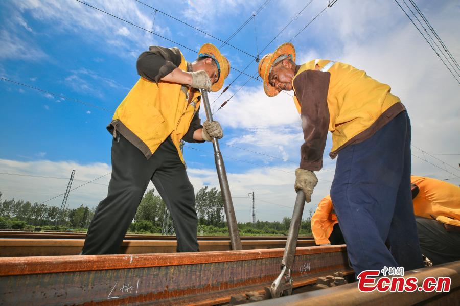A team of 16 workers toils outdoors to guarantee railway safety amid heat wave as temperatures of the railway track can reach nearly 50 degree Celsius.