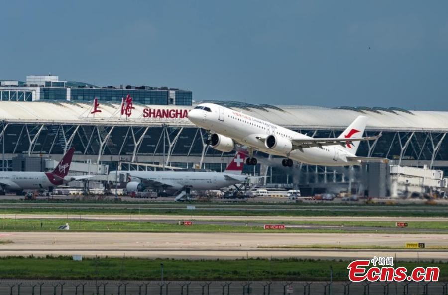 The second commercial flight of the C919, China's self-developed large passenger aircraft, takes off from Shanghai Pudong International Airport, July 16, 2023. (Photo provided to China News Service)