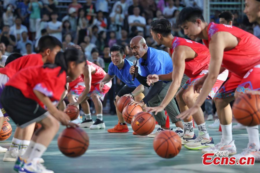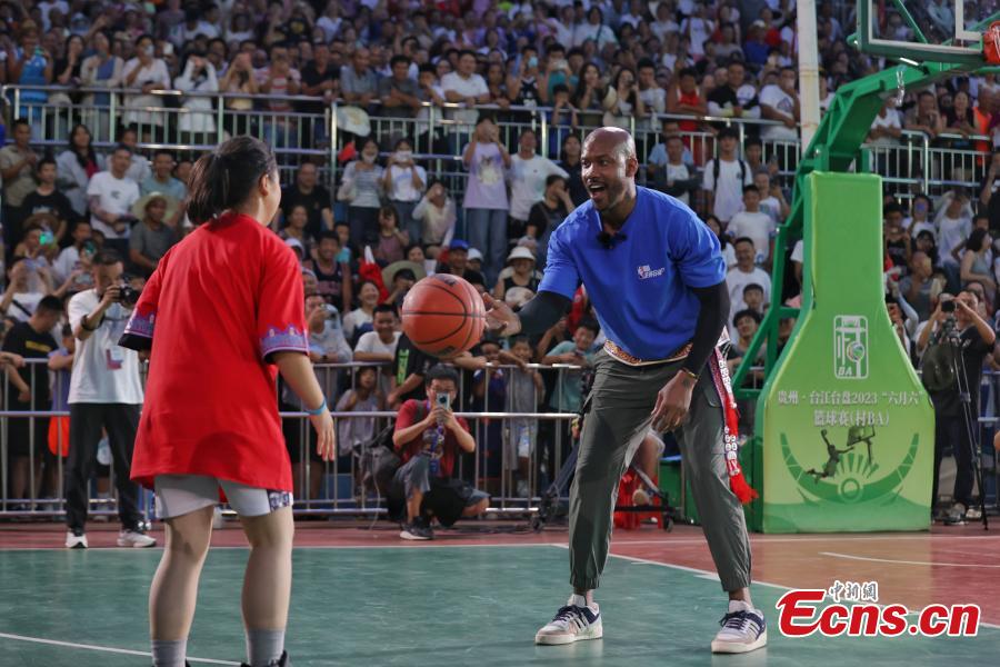 Stephon Marbury, former NBA star, plays basketball with local kids ahead of a match in Taipan Village, Taijiang County, Qiandongnan Miao and Dong Autonomous Prefecture, southwest China's Guizhou Province, July 24, 2023. (Photo: China News Service/Qu Honglun)