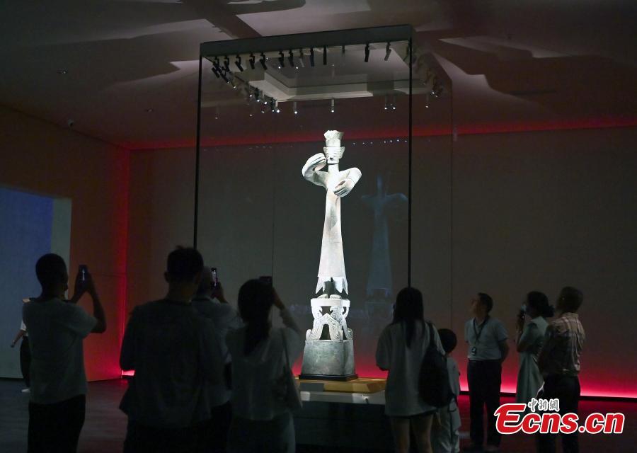 A bronze standing figure is exhibited at the new building of the Sanxingdui Museum in Guanghan, southwest China's Sichuan Province, July 27, 2023. (Photo: China News Service/An Yuan)