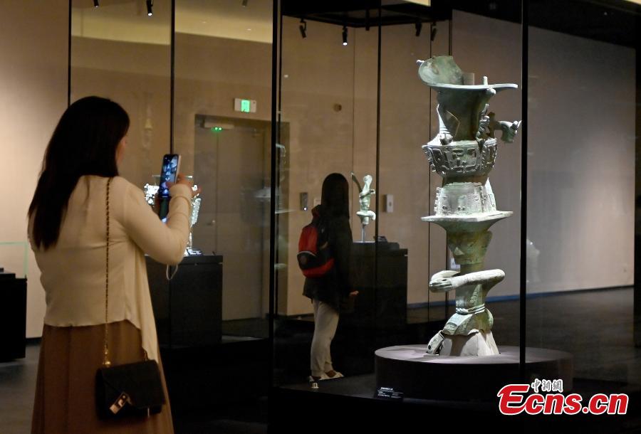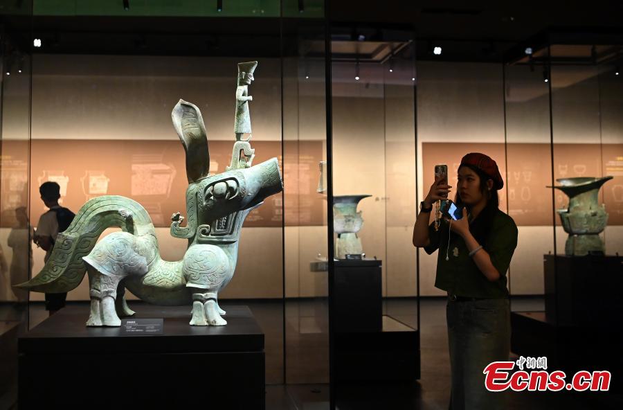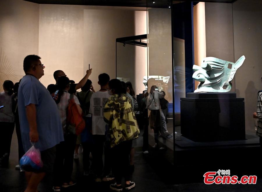 Visitors view cultural relics exhibited at the new building of the Sanxingdui Museum in Guanghan, southwest China's Sichuan Province, July 27, 2023. (Photo: China News Service/An Yuan)