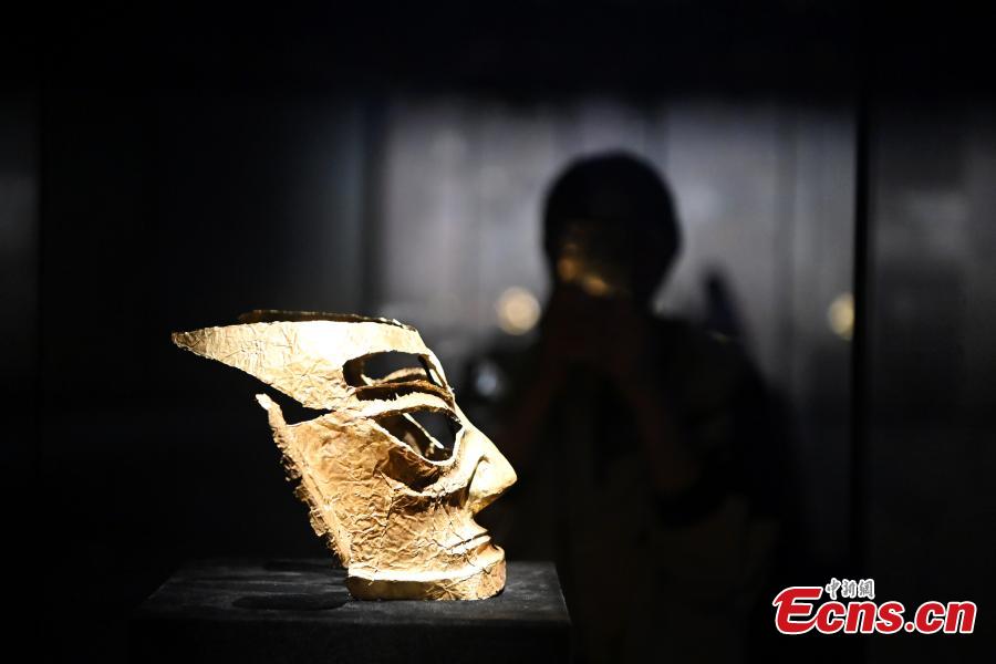 A visitor takes photos of a golden mask exhibited at the new building of the Sanxingdui Museum in Guanghan, southwest China's Sichuan Province, July 27, 2023. (Photo: China News Service/An Yuan)