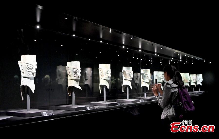 A visitor takes photos of bronze heads exhibited at the new building of the Sanxingdui Museum in Guanghan, southwest China's Sichuan Province, July 27, 2023. (Photo: China News Service/An Yuan)