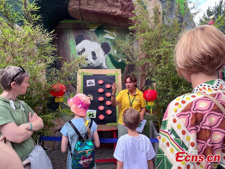 A staff member introduces giant pandas' living habits to kids at the Moscow Zoo in Russia, July 30, 2023. (Photo: China News Service/Tian Bing)