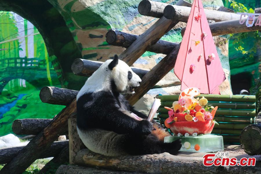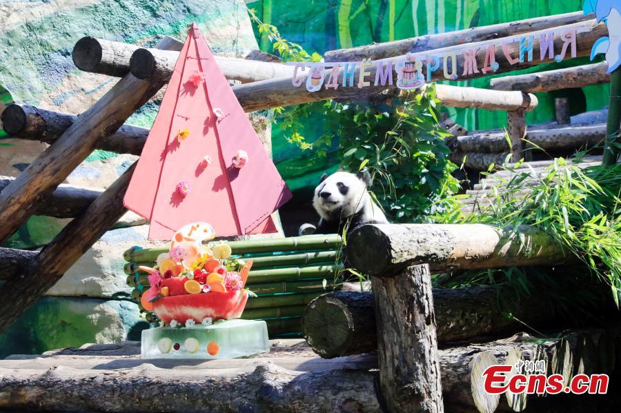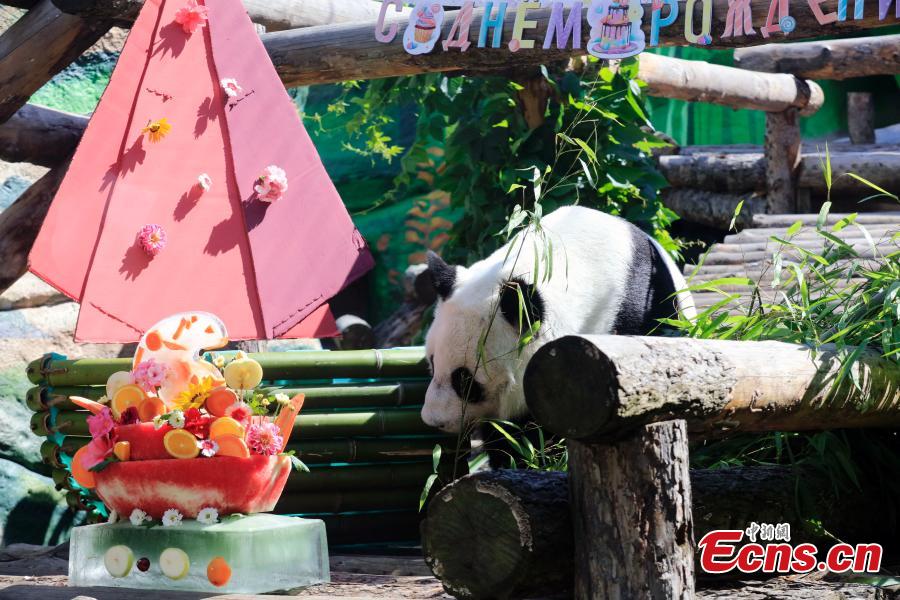 Giant panda Ru Yi eats bamboo during a birthday party at the Moscow Zoo in Russia, July 30, 2023. (Photo: China News Service/Tian Bing)