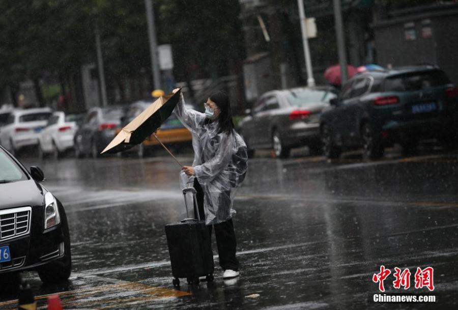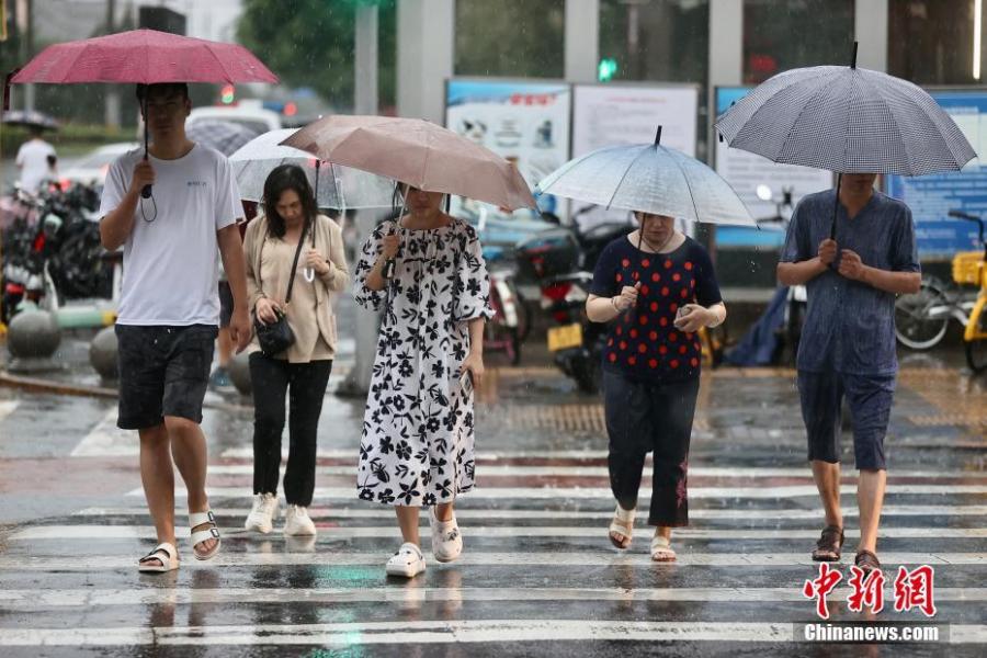 Pedestrians brave the heavy rain on a street in Beijing, July 30, 2023. (Photo: China News Service/Yi Haifei)