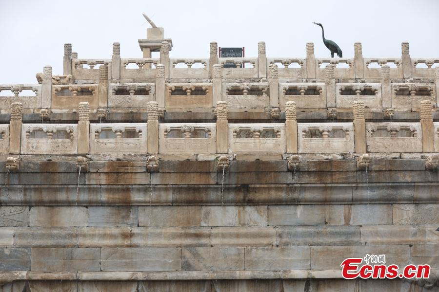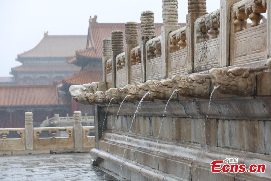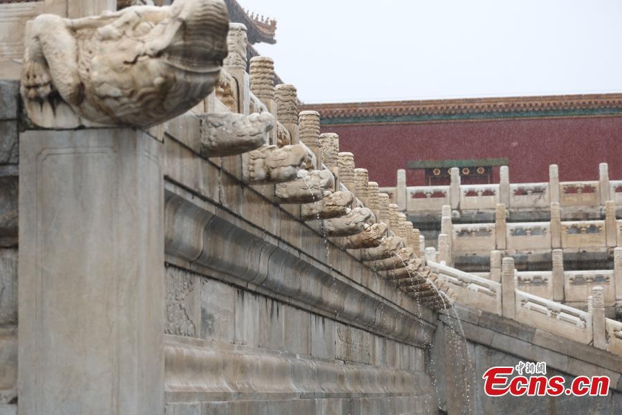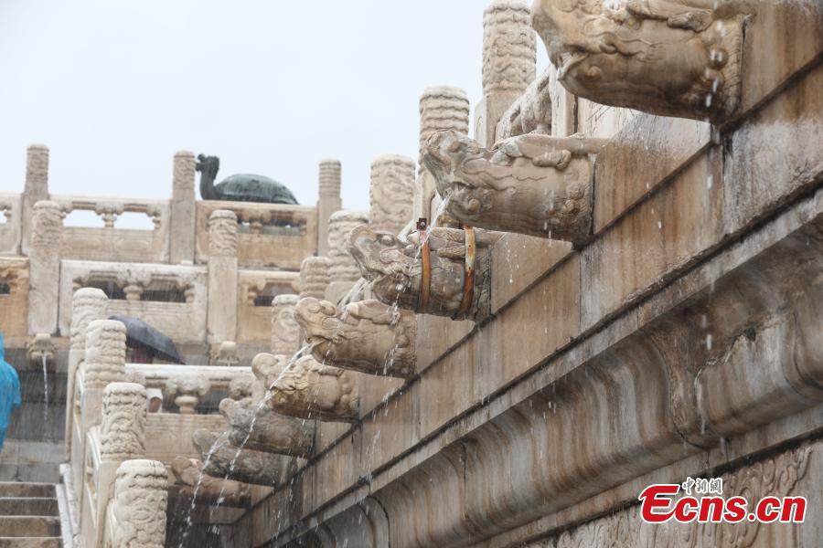 Rainwater spouts from a dragon-shaped ancient drainage system in the Palace Museum during a heavy rainstorm in Beijing, July 31, 2023. (Photo: China News Service/Sheng Jiapeng)