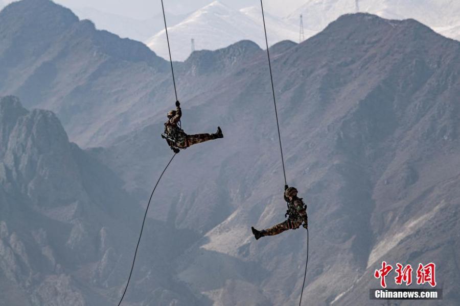 Female soldiers conduct a series of rappels and sling loads from helicopters in southwest China's Tibet Autonomous Region. (Photo: China News Service/Wang Shudong)