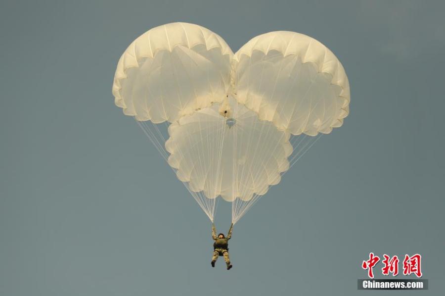 A soldier of special operations under the PLA 75th Group Army descends to the ground during a parachute training in southwest China's Yunnan Province. (Photo: China News Service/Lin Sijin)