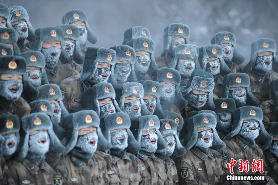 Some 150 newly recruited soldiers attend a training session in freezing temperatures in Yichuan, northeast China's Heilongjiang Province. (File photo/VCG)