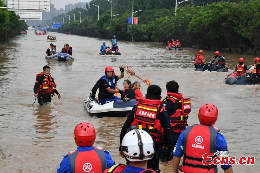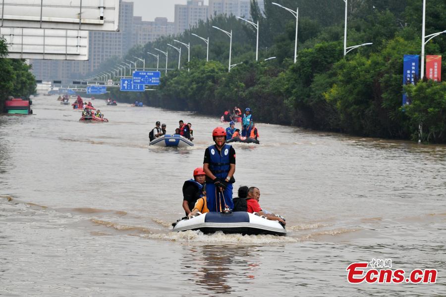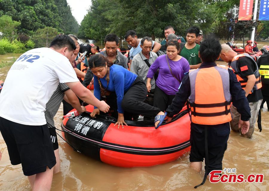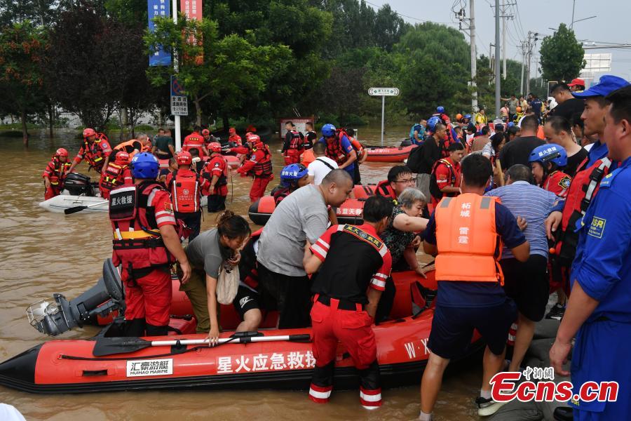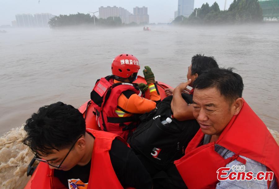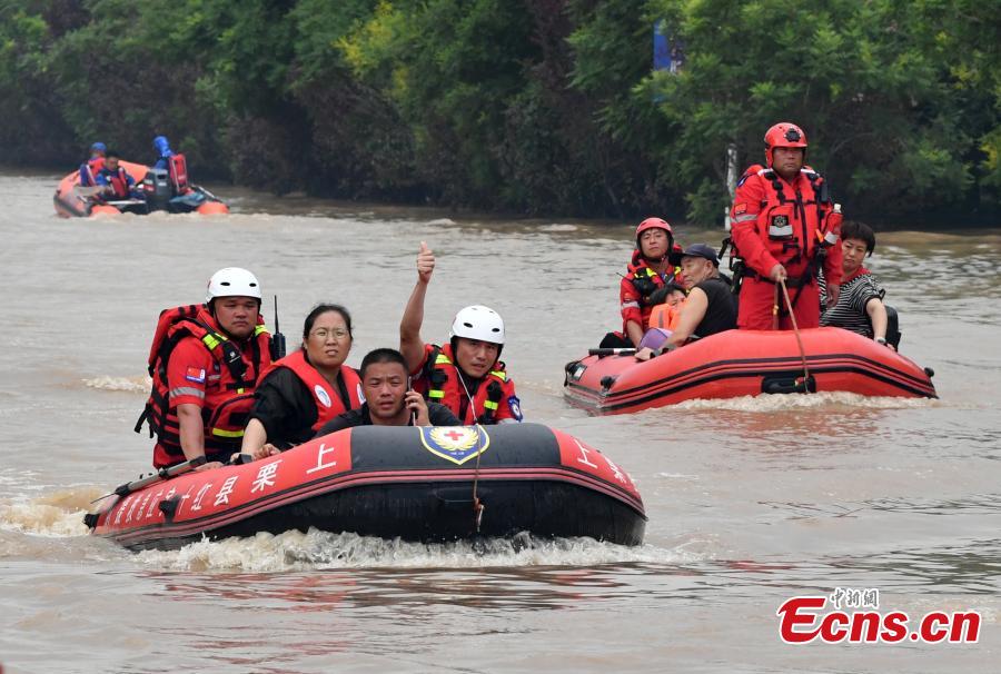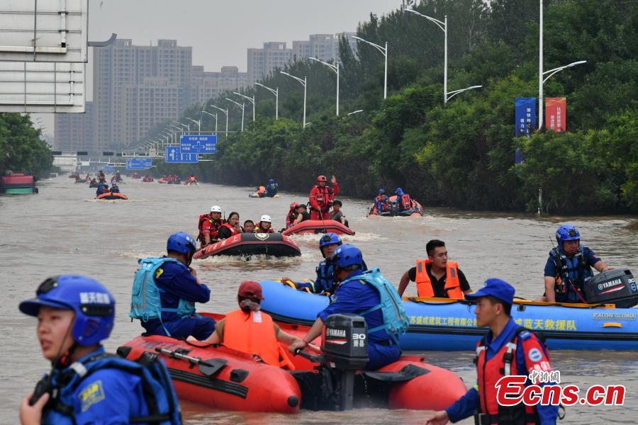 Rescuers transfer trapped people on rubber boats in Zhuozhou, north China's Hebei Province, Aug. 2, 2023. (Photo: China News Service/Zhai Yujia)