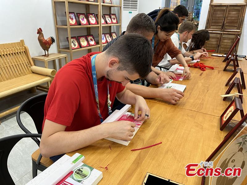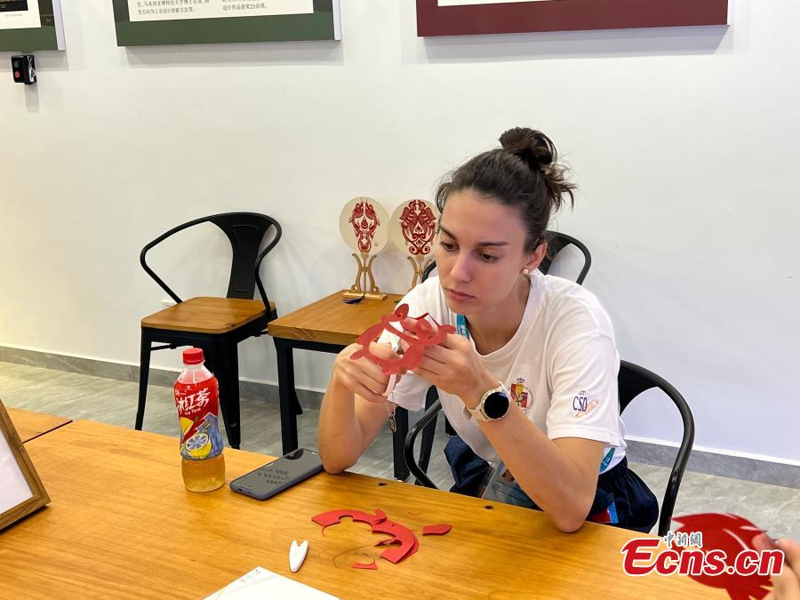 A foreign athlete learns Chinese paper-cutting at the Chengdu Universiade Athletes' Village, southwest China's Sichuan Province, Aug. 2, 2023. (Photo: China News Service/Cheng Jiaxin)