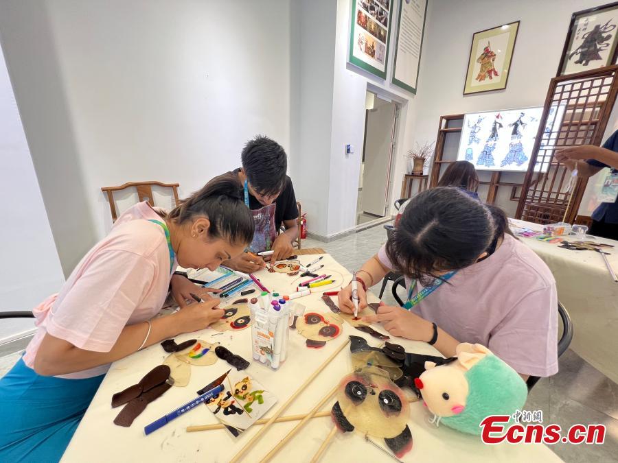 Foreign athletes learn to make shadow puppet at the Chengdu Universiade Athletes' Village, southwest China's Sichuan Province, Aug. 2, 2023. (Photo: China News Service/Cheng Jiaxin)
