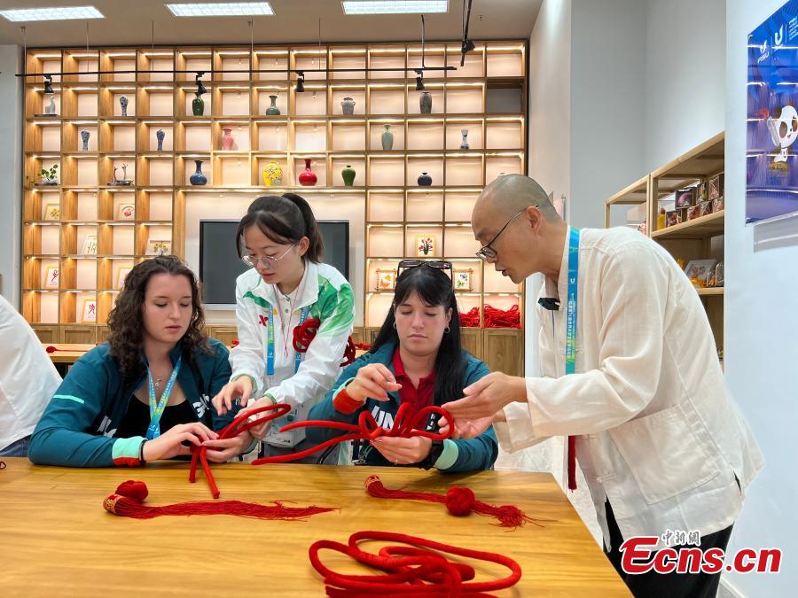 Foreign athletes learn to make Chinese knots at the athletes' village in Chengdu, southwest China's Sichuan Province, Aug. 2, 2023. (Photo: China News Service/Cheng Jiaxin)