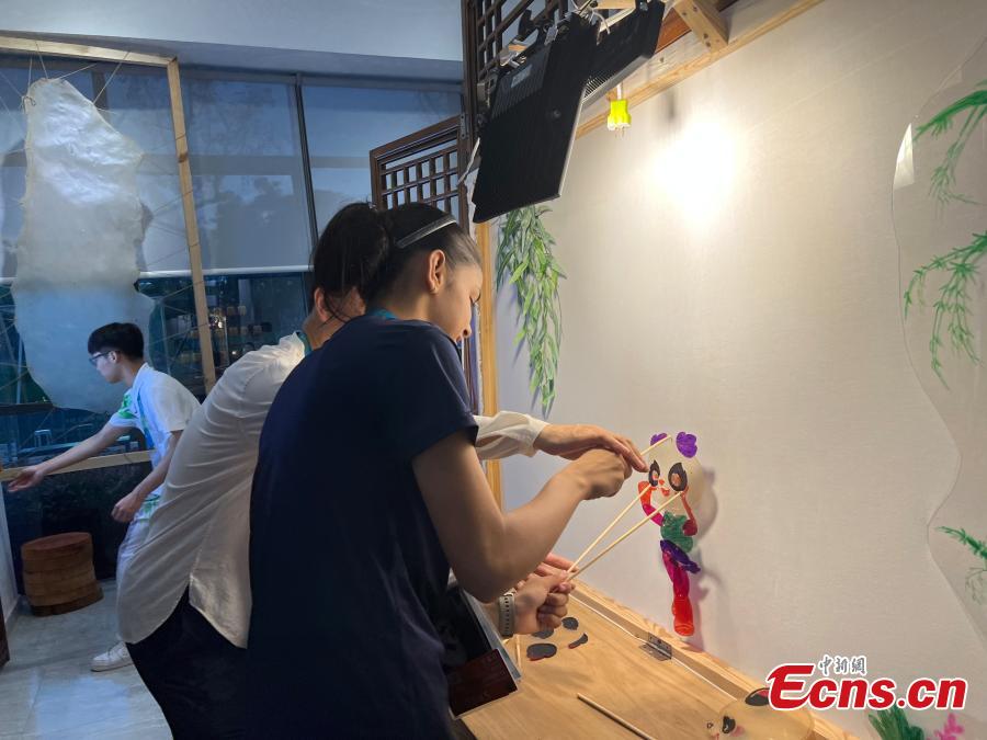 A foreign athlete learns to play shadow puppet at the Chengdu Universiade Athletes' Village, southwest China's Sichuan Province, Aug. 2, 2023. (Photo: China News Service/Cheng Jiaxin)