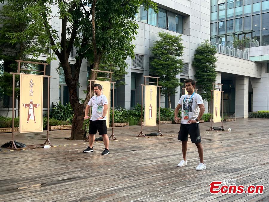 Foreign athletes practise Tai Chi at the Chengdu Universiade Athletes' Village, southwest China's Sichuan Province, Aug. 2, 2023. (Photo: China News Service/Cheng Jiaxin)