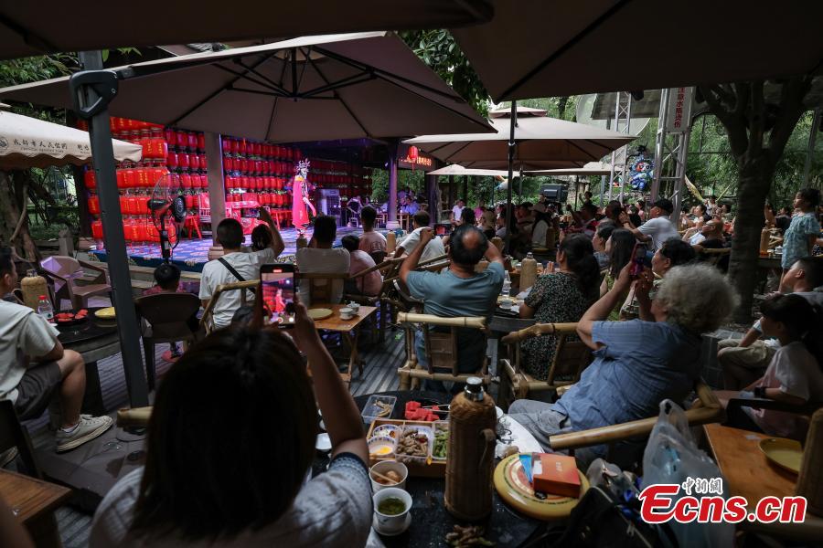Tourists watch a performance at a tea house of Renmin Park in Chengdu, southwest China's Sichuan Province, Aug. 1, 2023. (Photo: China News Service/Qu Honglun)
