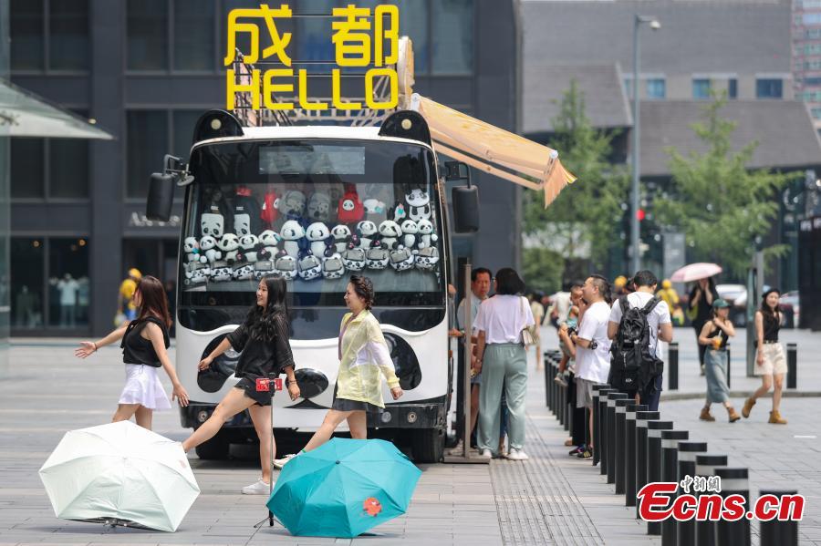 Women pose for photos in front of a panda-themed bus at Chunxi Road in Chengdu, southwest China's Sichuan Province, Aug. 1, 2023. (Photo: China News Service/Qu Honglun)