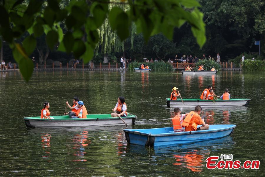 Tourists take paddle boats at Renmin Park in Chengdu, southwest China's Sichuan Province, Aug. 1, 2023. (Photo: China News Service/Qu Honglun)
