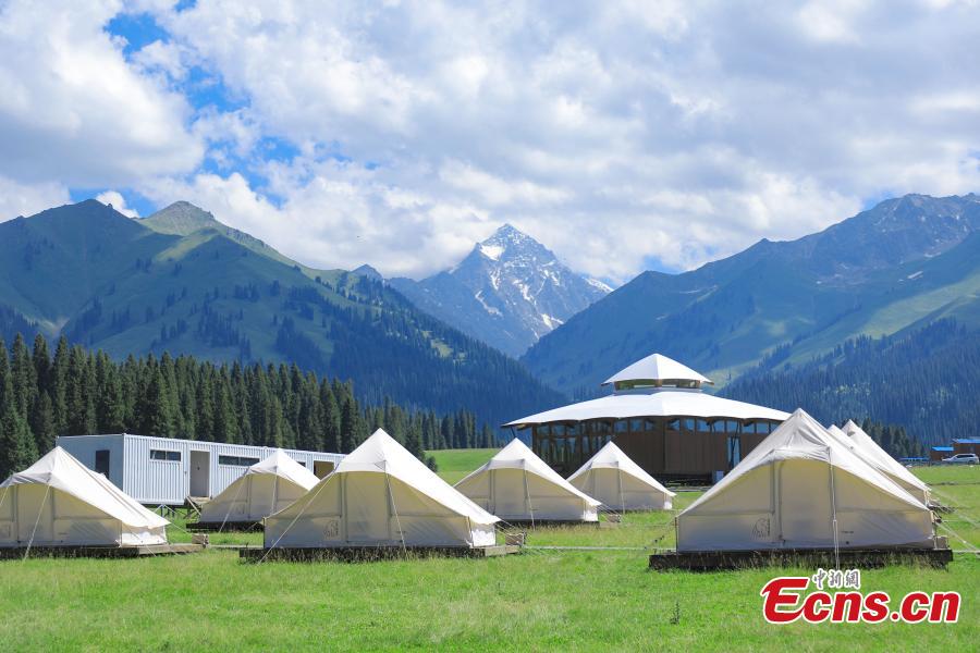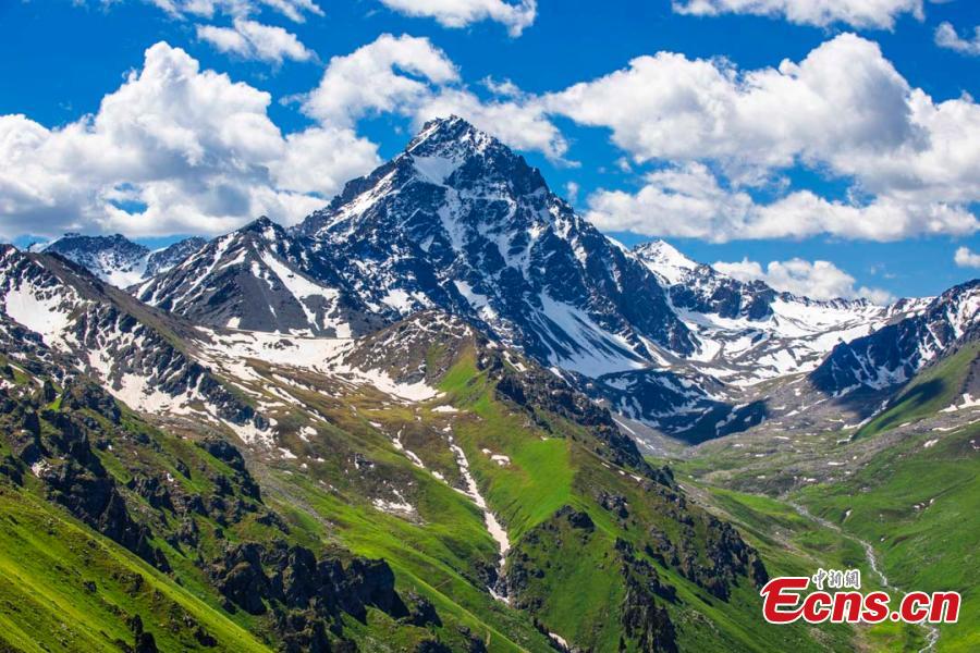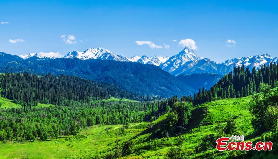 Kuerdening scenic area boasts breathtaking scenery from lush meadows and forest to snow-peaked mountains in summer in northwest China's Xinjiang Uyghur Autonomous Region. (Photo provided to China News Service)