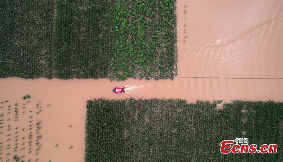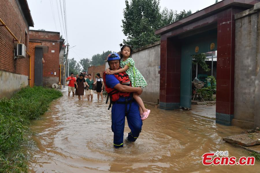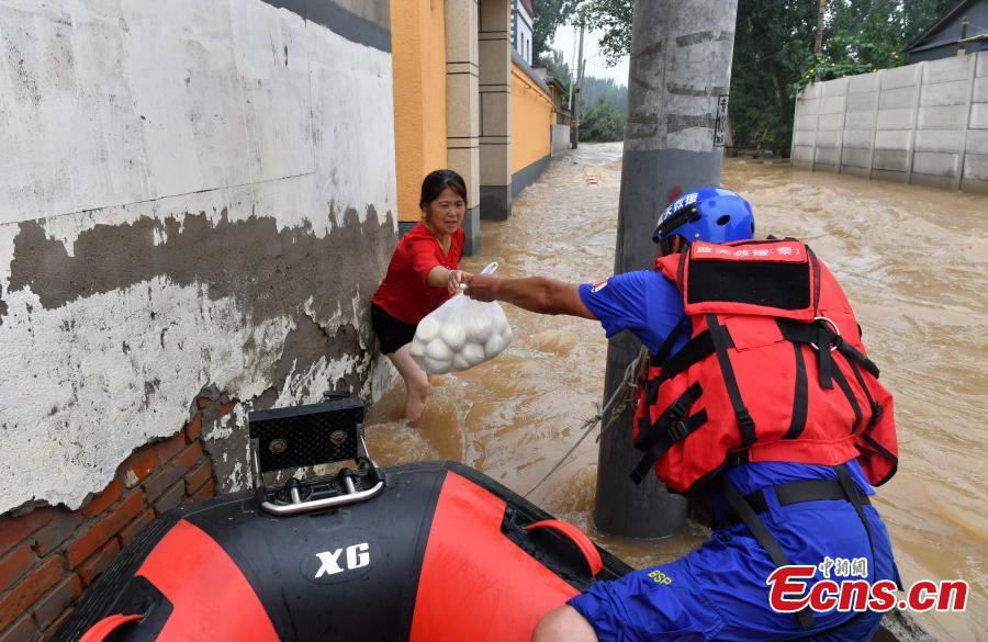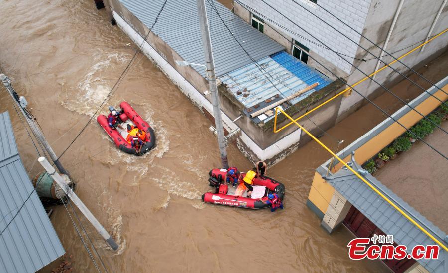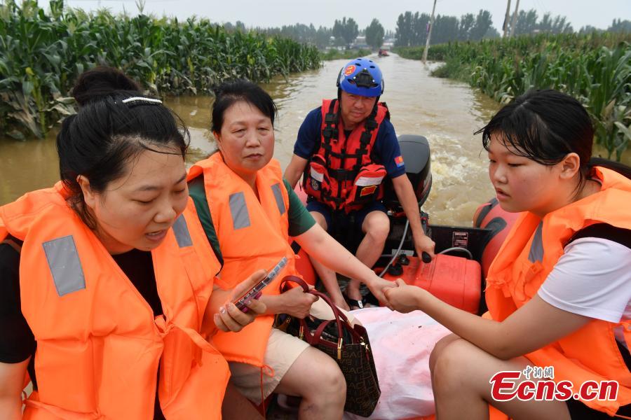 The Blue Sky Rescue Team members transfer villagers trapped by floodwater in Dongfeng Village in Zhuozhou, north China’s Hebei Province, Aug. 3, 2023. (Photo/China News Service)