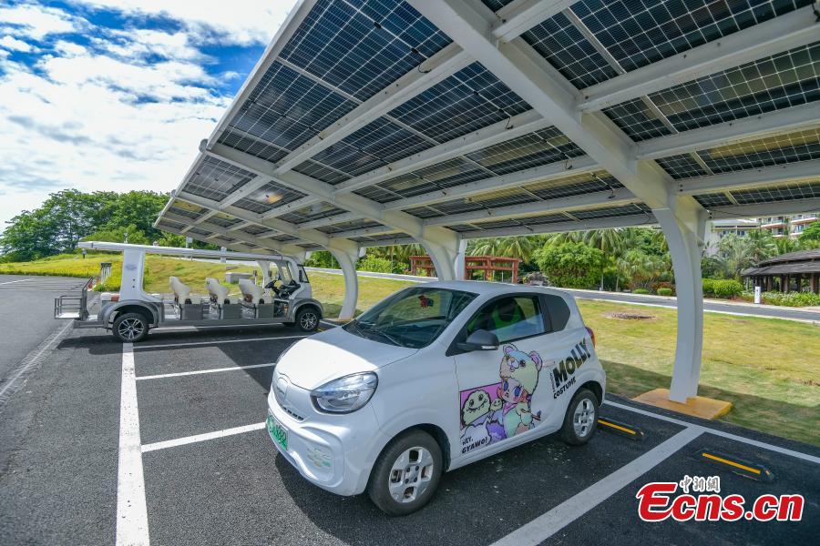 A sunshade is install with solar panels at a parking lot in Boao, south China's Hainan Province, Aug. 3, 2023. (Photo: China News Service/Luo Yunfei)