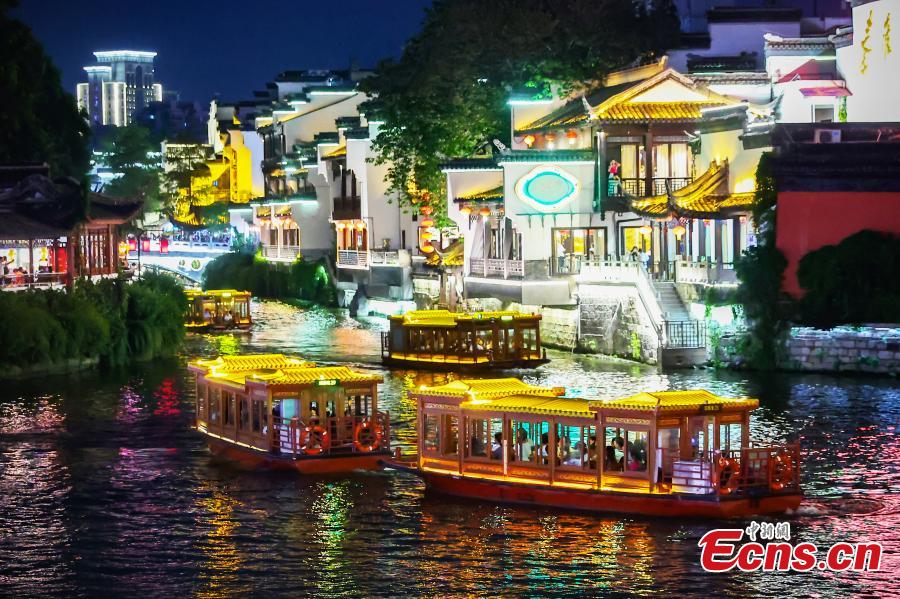 Sightseeing boats sail on Qinhuai River in the famous Fuzimiao (Confucius Temple) historic district of Nanjing, east China's Jiangsu Province, Aug. 6, 2023. Illuminated Qinhuai River reflects the prosperity of a capital of six Chinese dynasties in ancient China. (Photo: China News Service/Yang Bo)