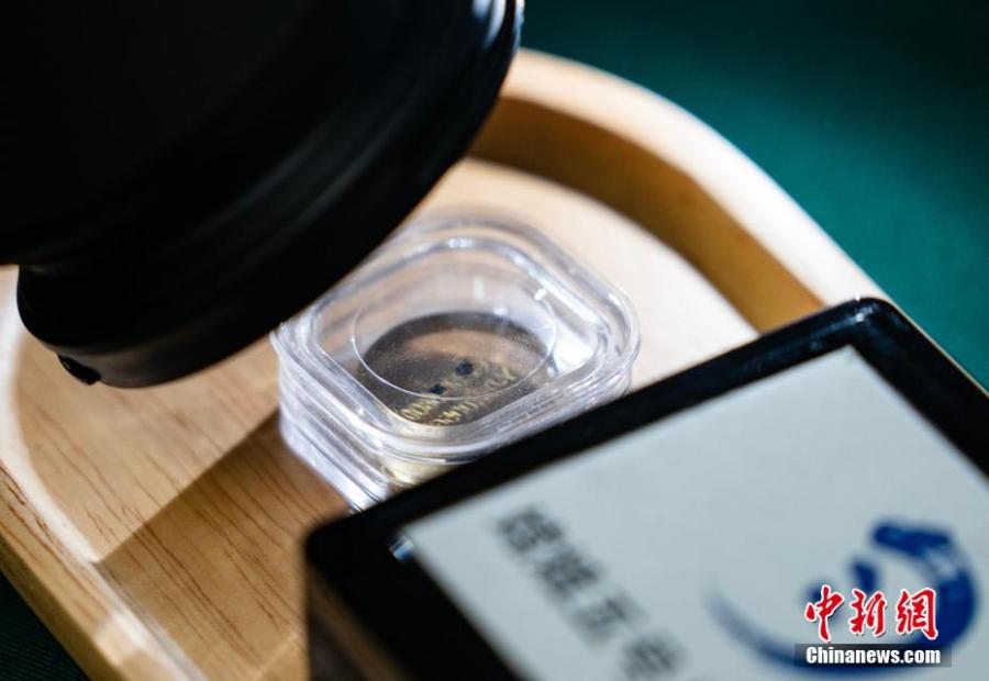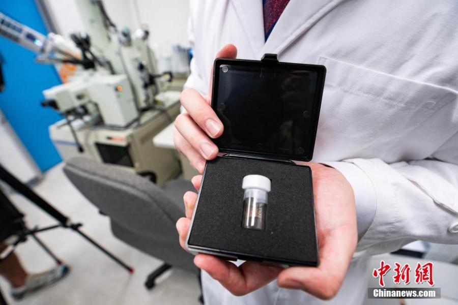 Doctor Yuqi Qian displays one of the lunar soil sample he retrieved from Beijing in the University of Hong Kong, Aug. 7, 2023. (Photo: China News Service/Hou Yu)