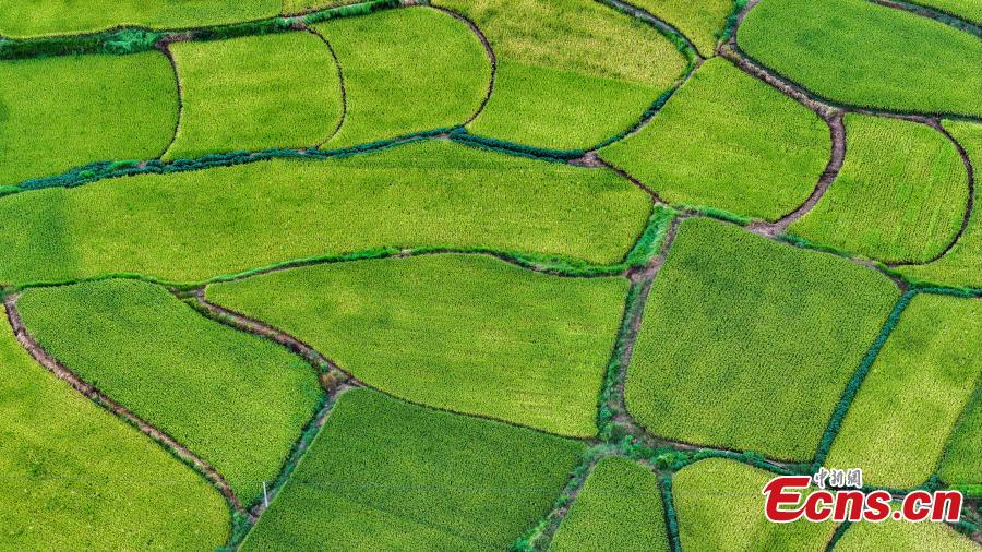 Aerial photo showcases the rice paddies in Bailing Town, Cangxi County, southwest China’s Sichuan Province, Aug, 27, 2023. (Photo:China News Service/ Wang Yugui)