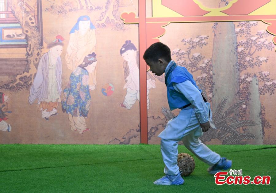 A boy tries "Cuju", archetype of modern game of football, at the China National Silk Museum ahead of the 19th Asian Games in Hangzhou, east China's Zhejiang Province, Sept. 14, 2023. (Photo: China News Service/Wang Gang)